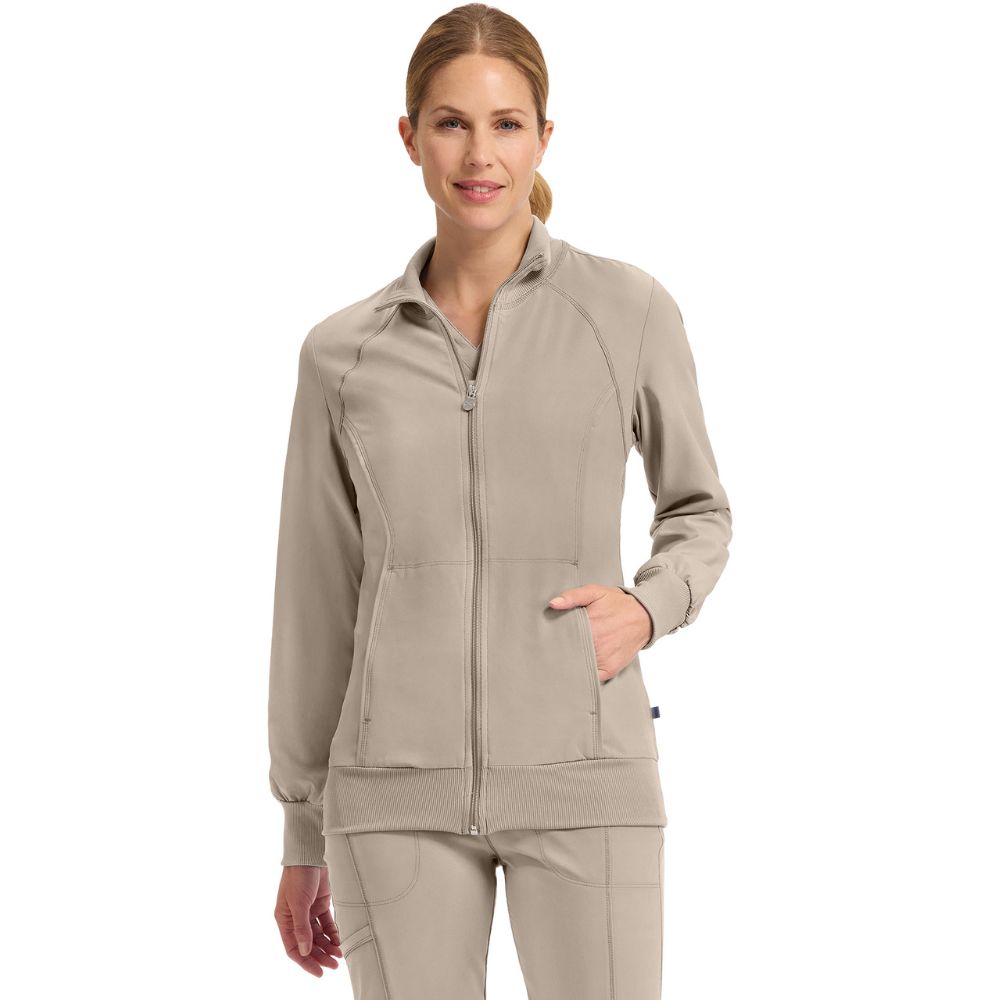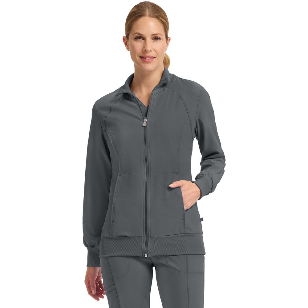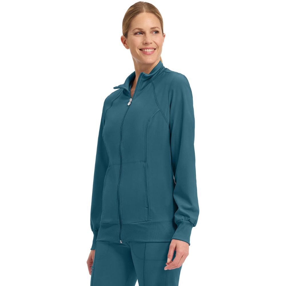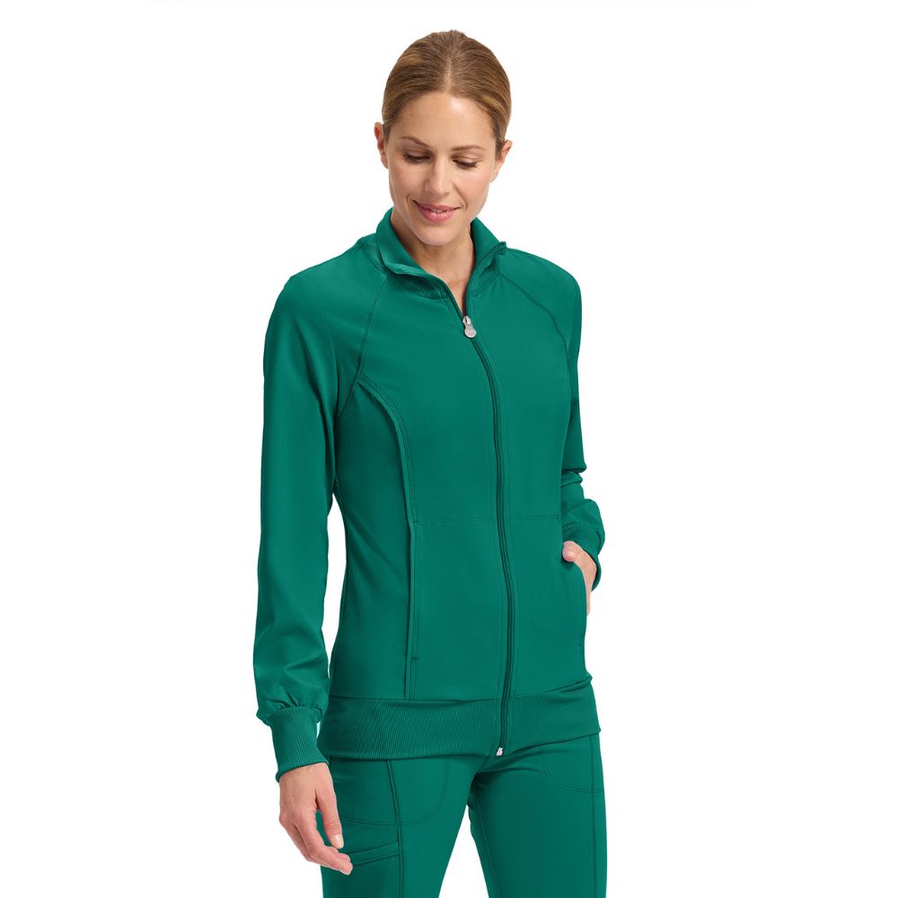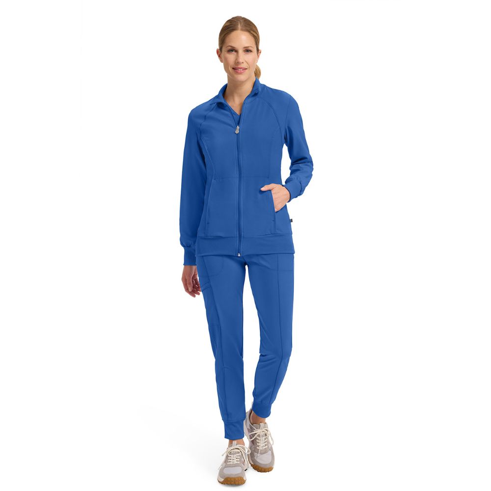 A Contemporary fit, sporty zip front warm-up jacket features front and back shoulder yokes, front princess seams with flat piping, hidden pockets with a zipper closure and a logo zipper pull. The back panel, collar, cuffs and waistband are made in a stretch rib knit for extra comfort. Coverstitch detail throughout. Center back length: 26″. The comfortable stretch poplin fabric and super stretchy rib knit is the perfect combo for healthcare