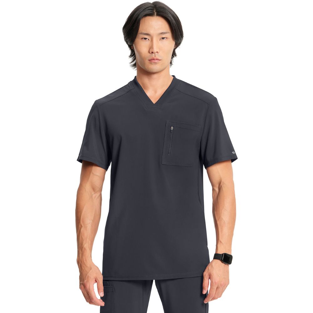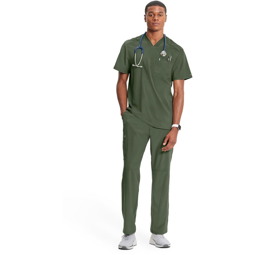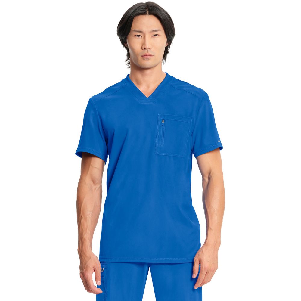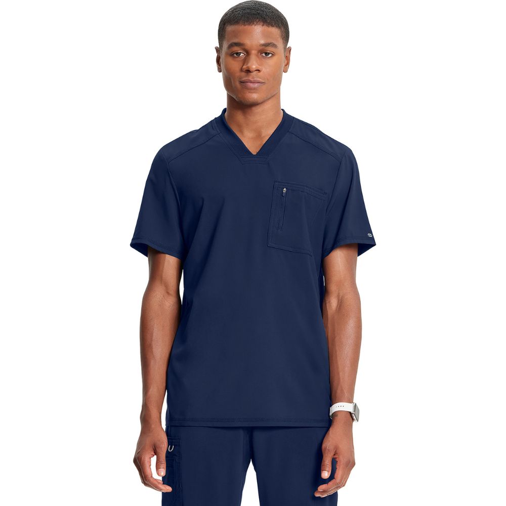 A Men’s Athletic fit V-neck top features a chest pocket with zip closure for security, instrument loop on the left sleeve, front and back yokes with triple-needle topstitching, and stretch rib knit neckband and back panels for extra comfort. Center back length: 29 1/2″. The comfortable stretch poplin fabric and super stretchy rib knit is the perfect combo for healthcare professionals.