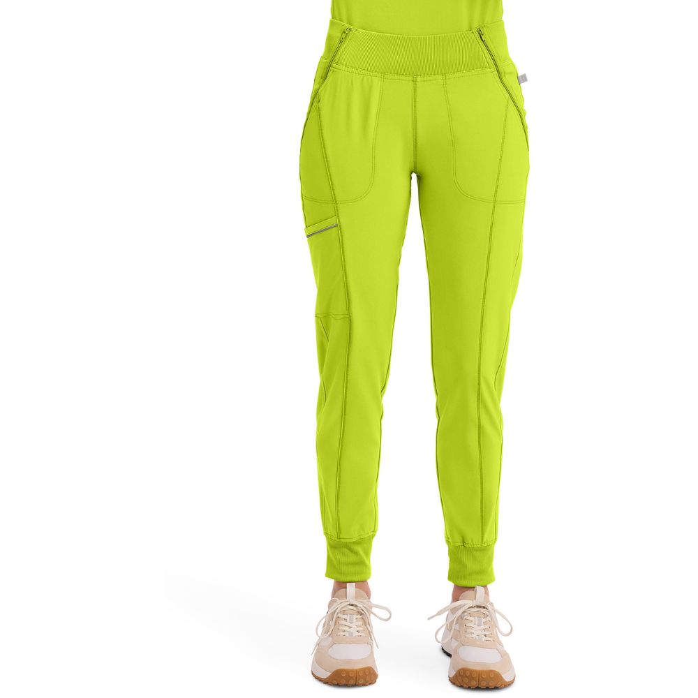 A Contemporary fit, mid rise, jogger features a rib knit elastic waistband with front angled zipper pockets, a cargo pocket with reflective tape, two back patch pockets, rib knit leg bands for adjustable length and coverstitch detail throughout. The comfortable stretch poplin fabric and super stretchy rib knit is the perfect combo for healthcare professionals.