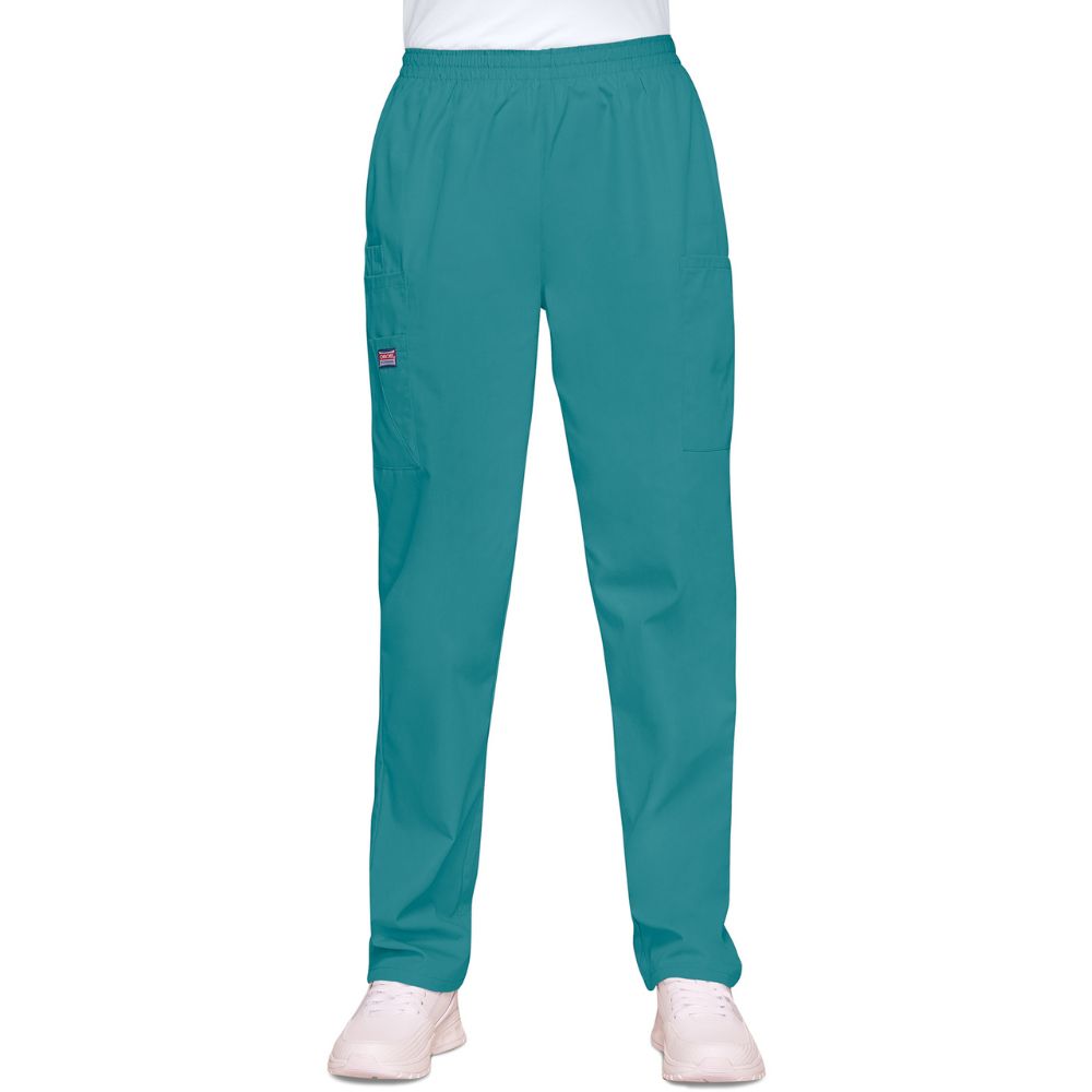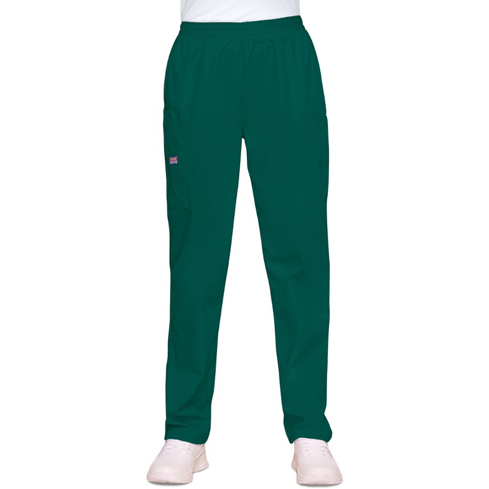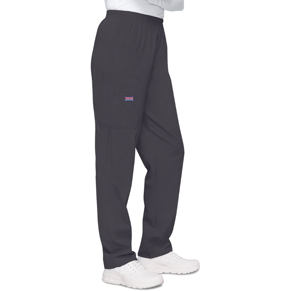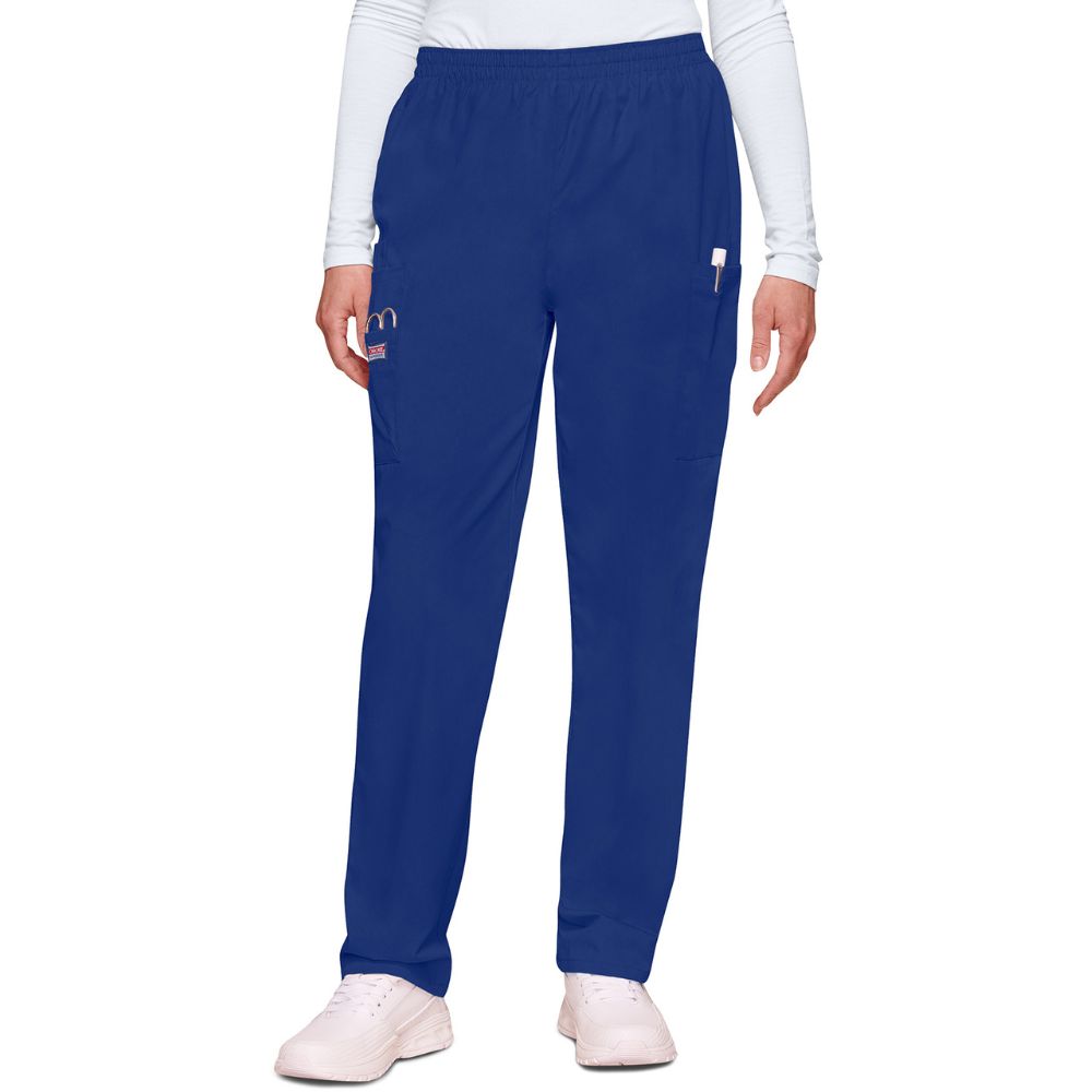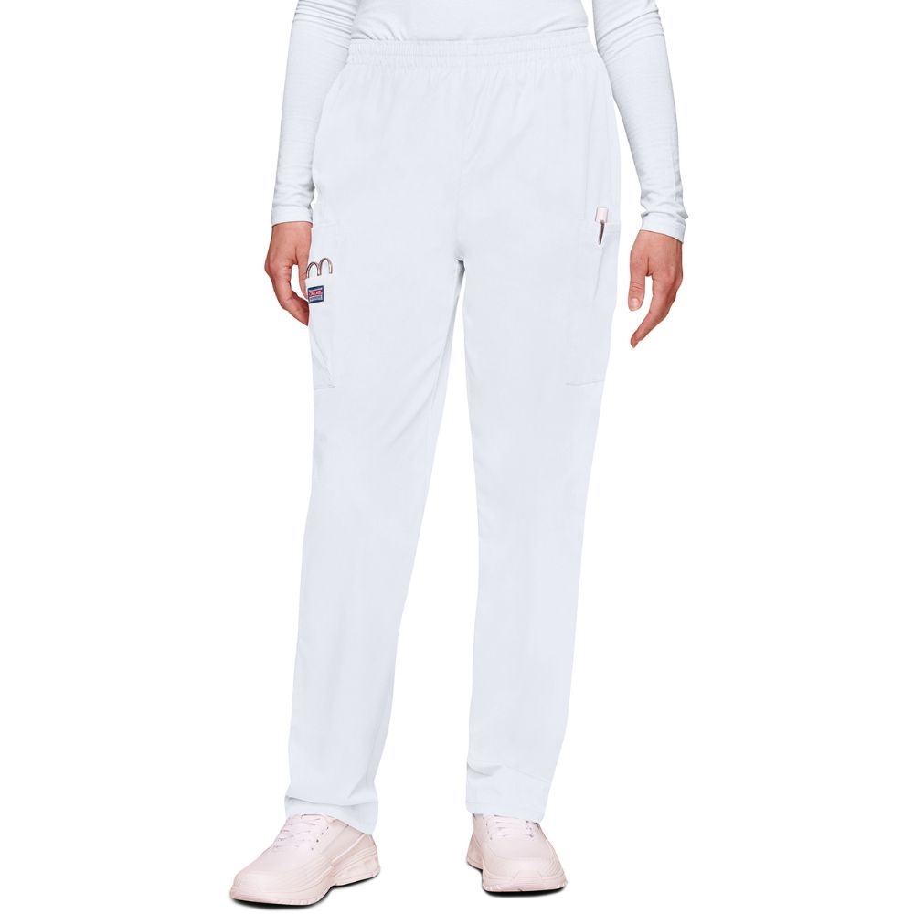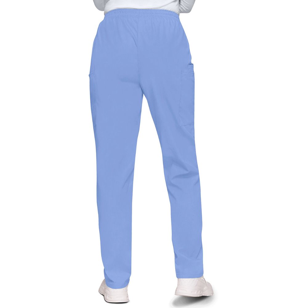 This Traditional fit, elastic waist utility pant features a natural rise and tapered leg, two cargo pockets, a cell phone pocket and an outside scissor pocket. Inseam 30″.