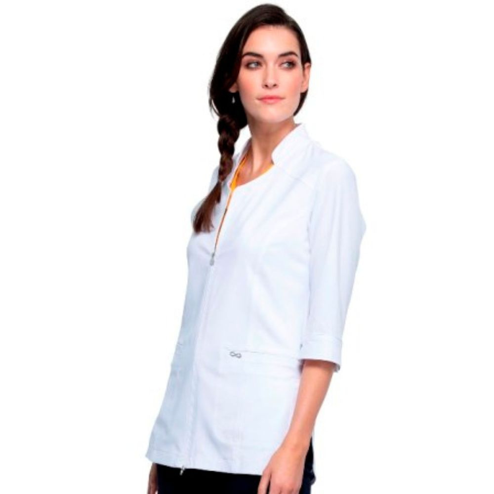 This updated mandarin collar V-neck tunic has a versatile two-way zip-front opening, flattering princess seams, two deep welt pockets and side slits. It also has front shoulder yokes, a hidden zip pocket inside the right front welt pocket, a center back knit panel for ease of movement and high-low hem. Contemporary Fit. Center Back: 30″