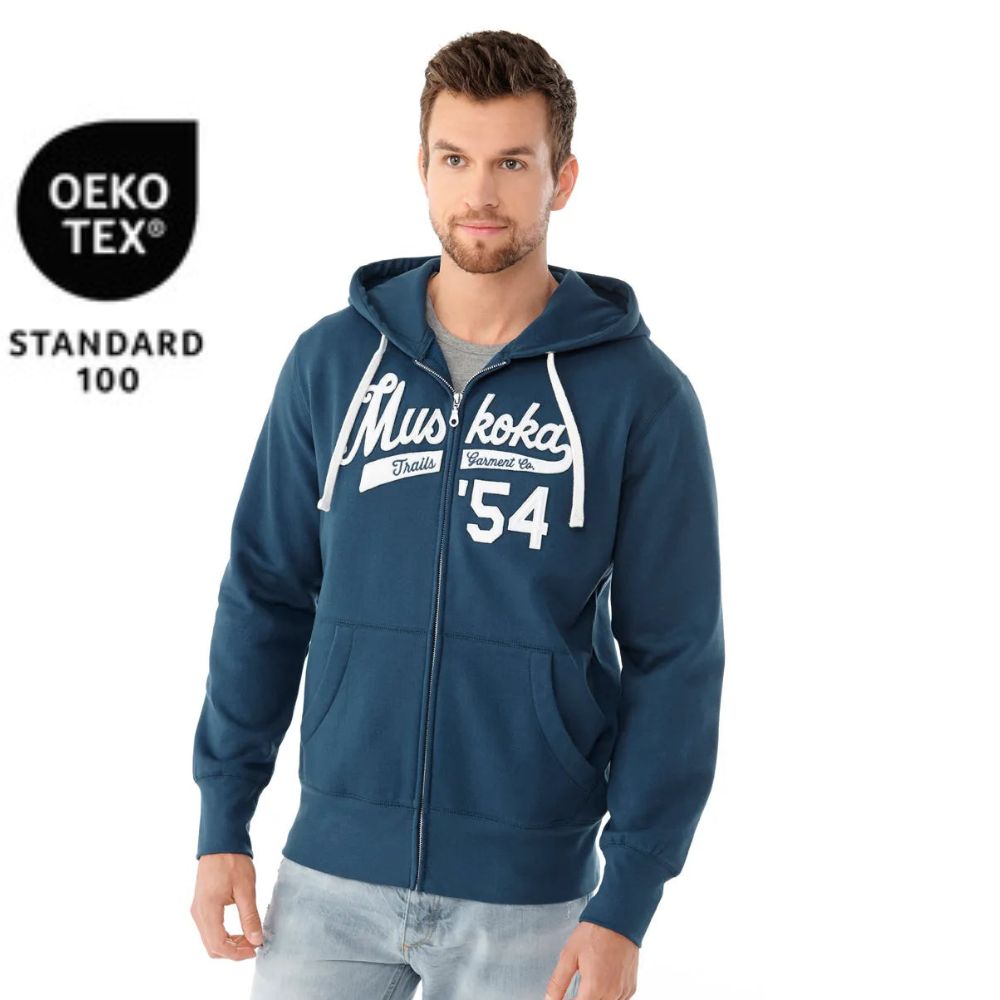 330 gsm – 9.7 oz./yd2 – 16.2 oz./lin. yd 80% cotton, 20% recycled polyester fleece. 3 ply fleece, 100% cotton face for superior print surface. Double layer hood lined with jersey. Contrast chevron tape at neck seam. Adjustable contrast flat draw cord. Double layer ribbed cuff and hem with spandex. YKK metal center front zipper. DTG – direct to garment printer friendly.