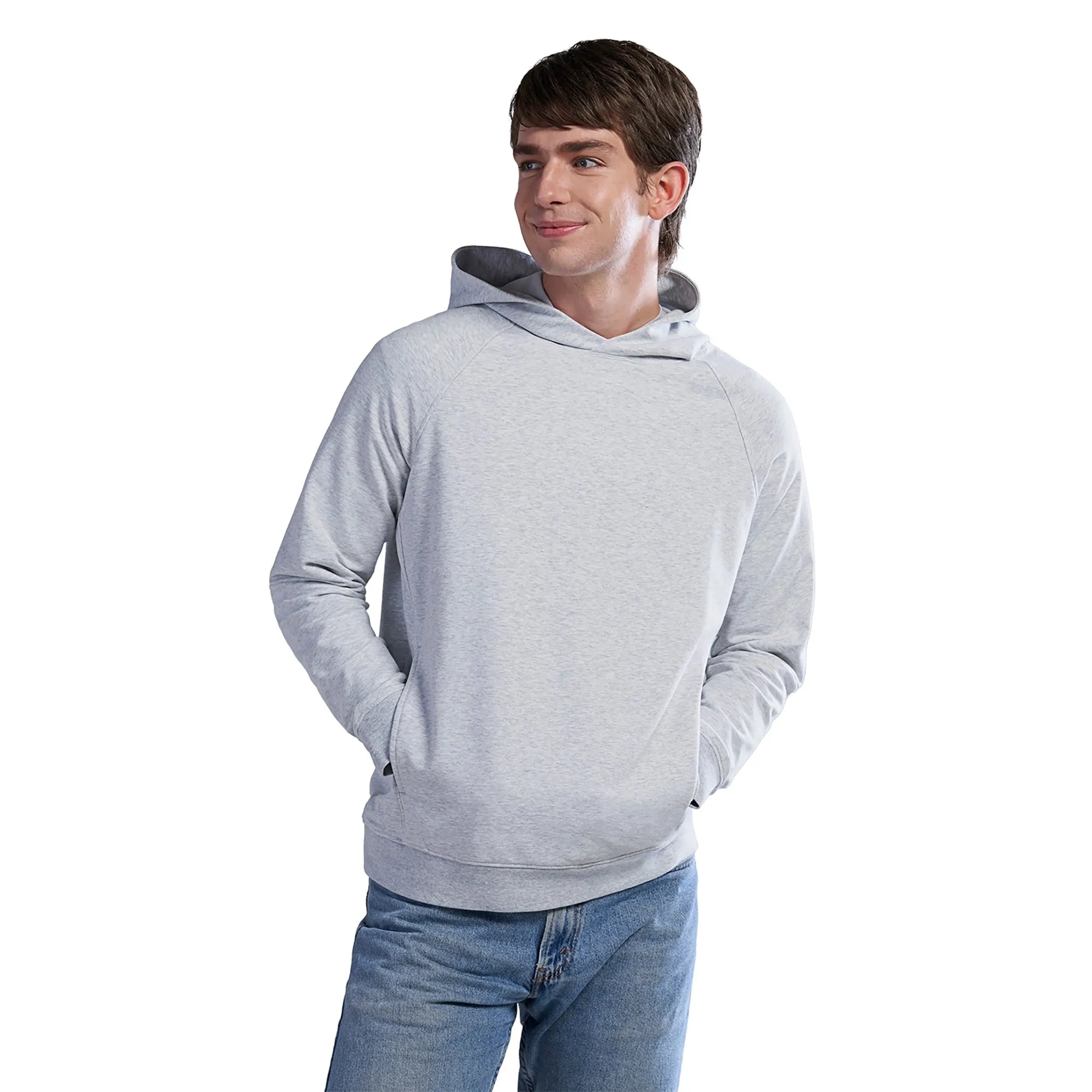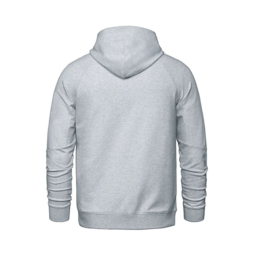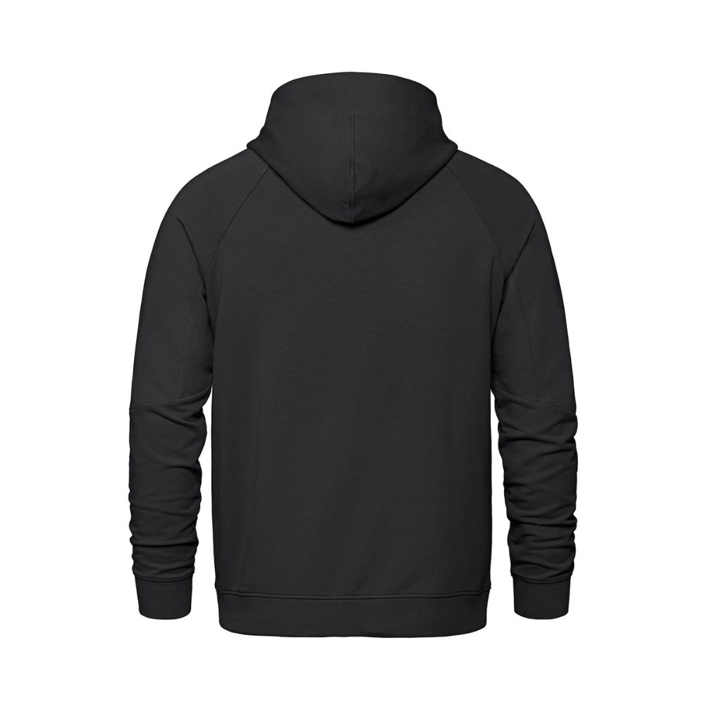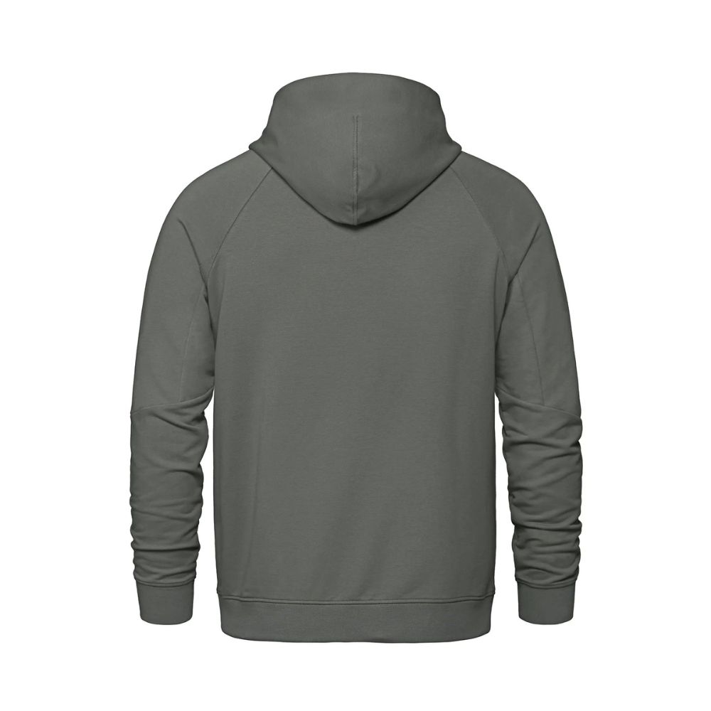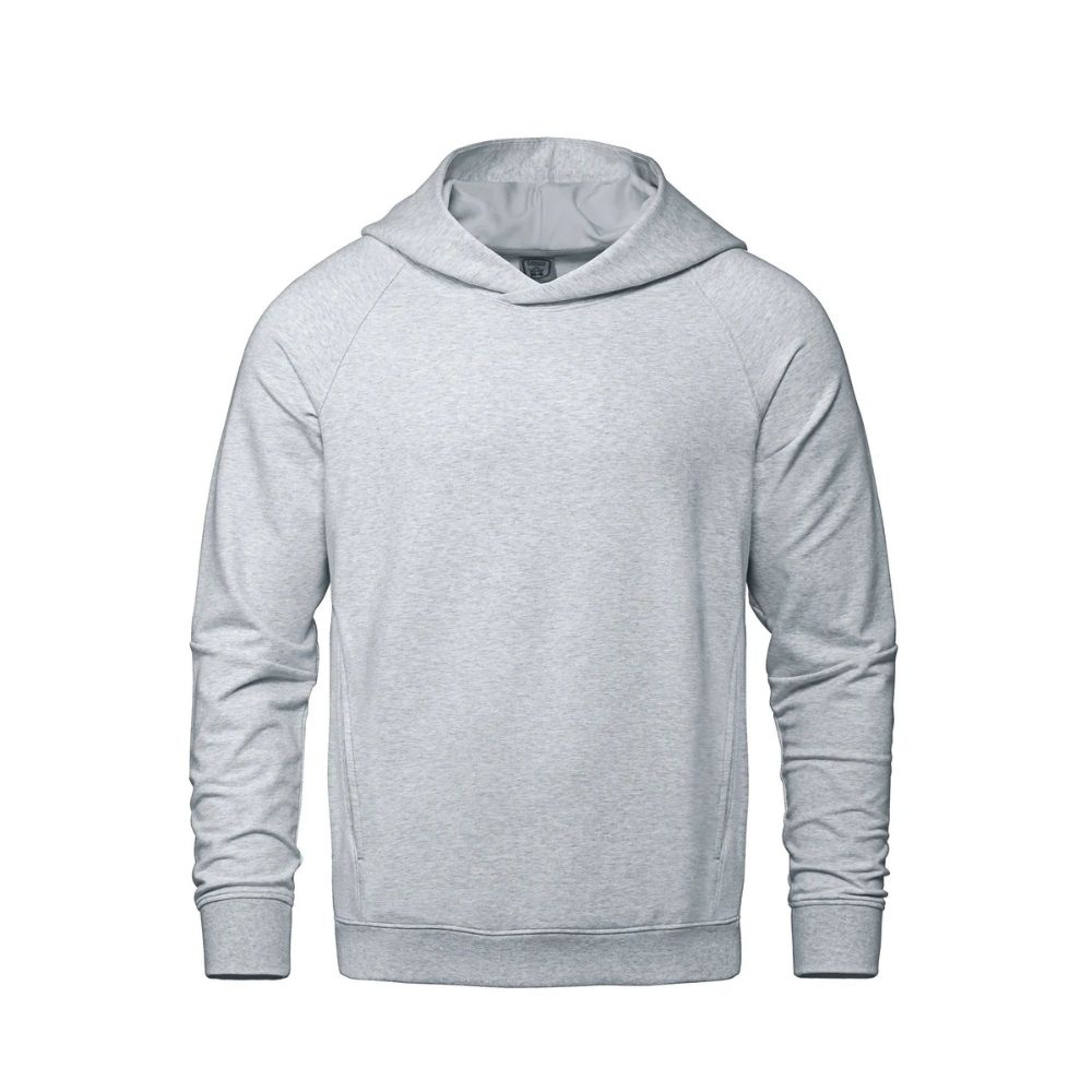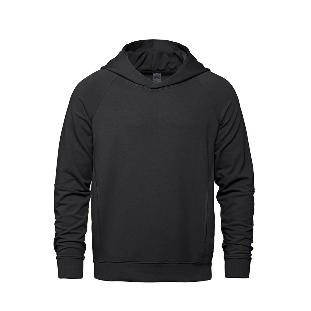 275GSM – 8.1oz/yd2 – 13.5 oz/lin. yd. 64% cotton, 30% recycled polyester, 6% spandex. Stretch french terry with wicking and anti-bacterial finishes. Crossover neckline hood with lining. Lower front on-seam pockets with hidden pockets inside. Raglan sleeve with seam detail at elbow. Rib knit sleeve cuff and body hem. Knit back neck tape. Tear-away label. Made in Cambodia