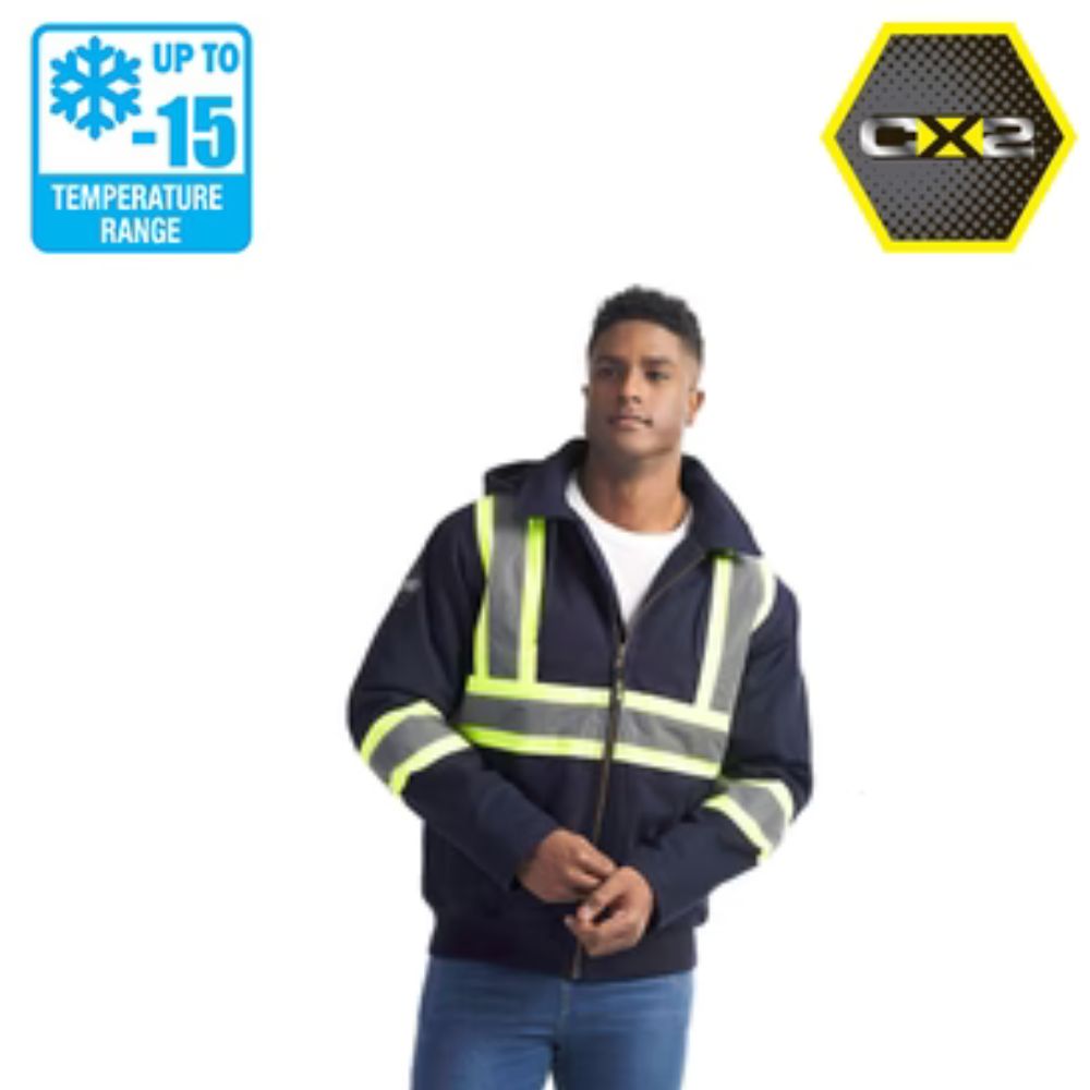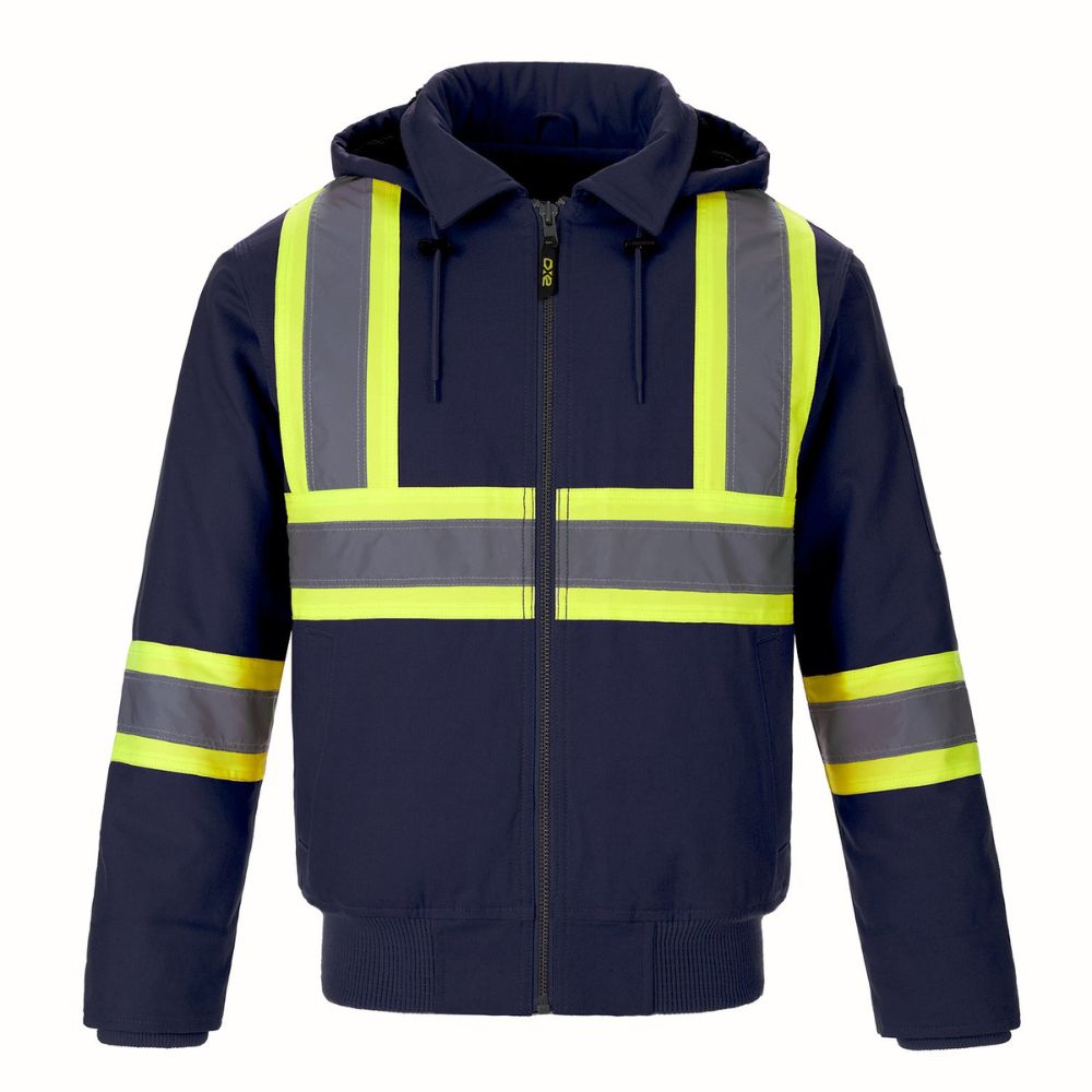 330 gsm – 9.7 oz./yd2 – 16.5 oz./lin. yd 100% cotton canvas with water repellent finish. Detachable hood, rib knit body hem and sleeve storm cuff. Body and hood are lined with polyester sherpa fleece. Sleeves are lined with taffeta lining and compacted insulation. Lower front welt pockets with snap closure. YKK zipper. Two interior chest pockets. 4” hi-vis contrast band with 2” reflective tape on front and back body and sleeves. Meets CSA standards.