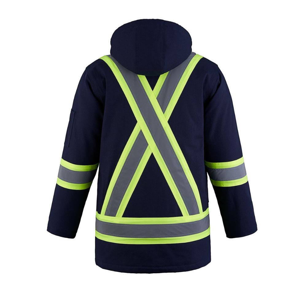 330 gsm – 9.7 oz./yd2 – 16.5 oz./lin. yd 100% cotton canvas with water repellent finish. Insulation: 220 gsm body, 170 gsm sleeves 100% polyester. Full body thermal quilted insulation. Snap detachable hood with adjustable drawcord. Rib knit storm cuff. 7 exterior pockets – 2 chest pockets, 2 side entry pockets, 2 lower front patch pockets with flap and 1 pocket on sleeve. Two interior pockets. YKK zipper. 4” hi-vis contrast band with 2” reflective tape on front and back body and sleeves. Meets CSA standards.