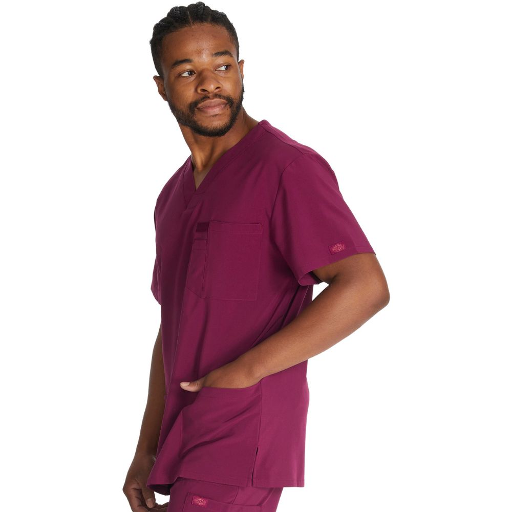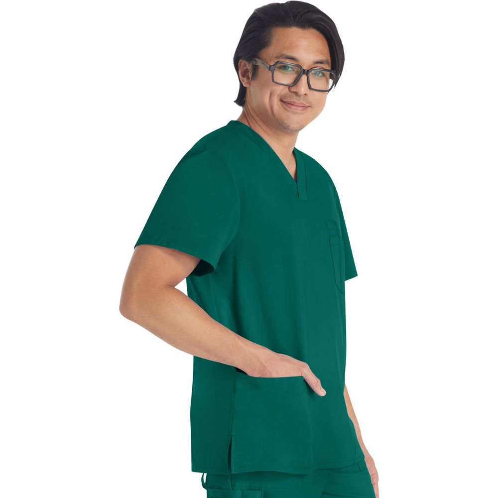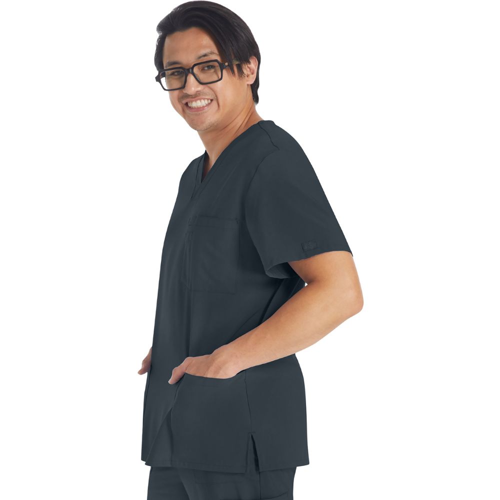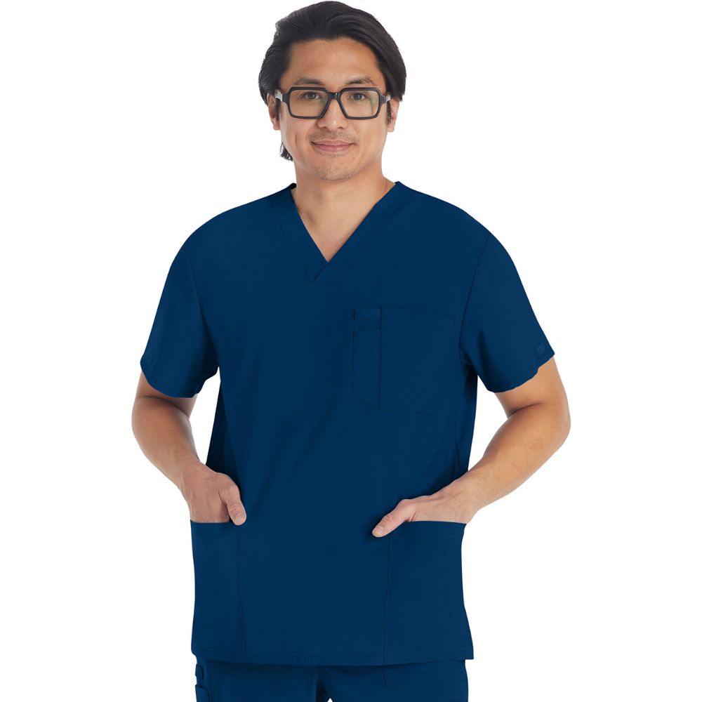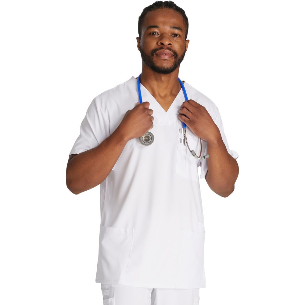 A Men’s fit top features four pockets; two patch pockets, a scissor pocket, and a chest pocket with pen slot. Also featured is a signature tonal woven label, a utility twill tape and a signature logo twill tape at the neck.
