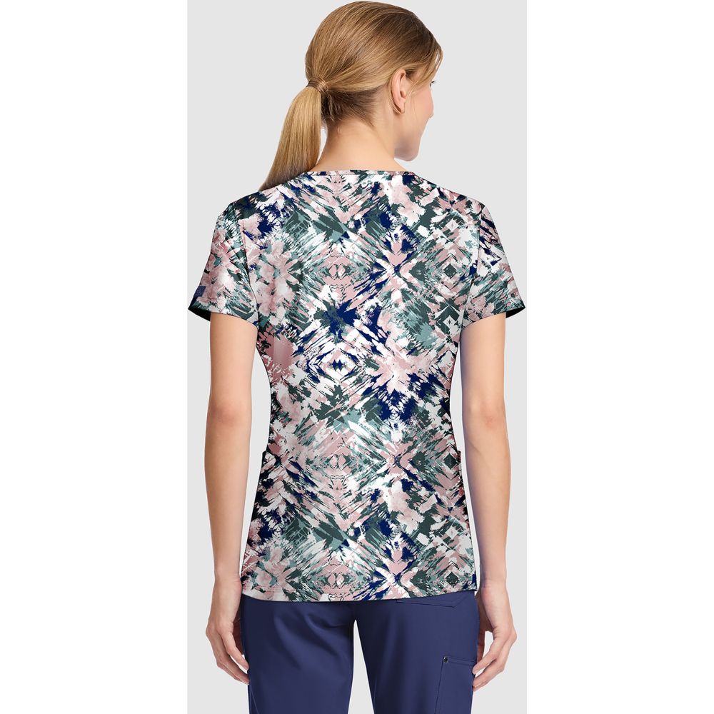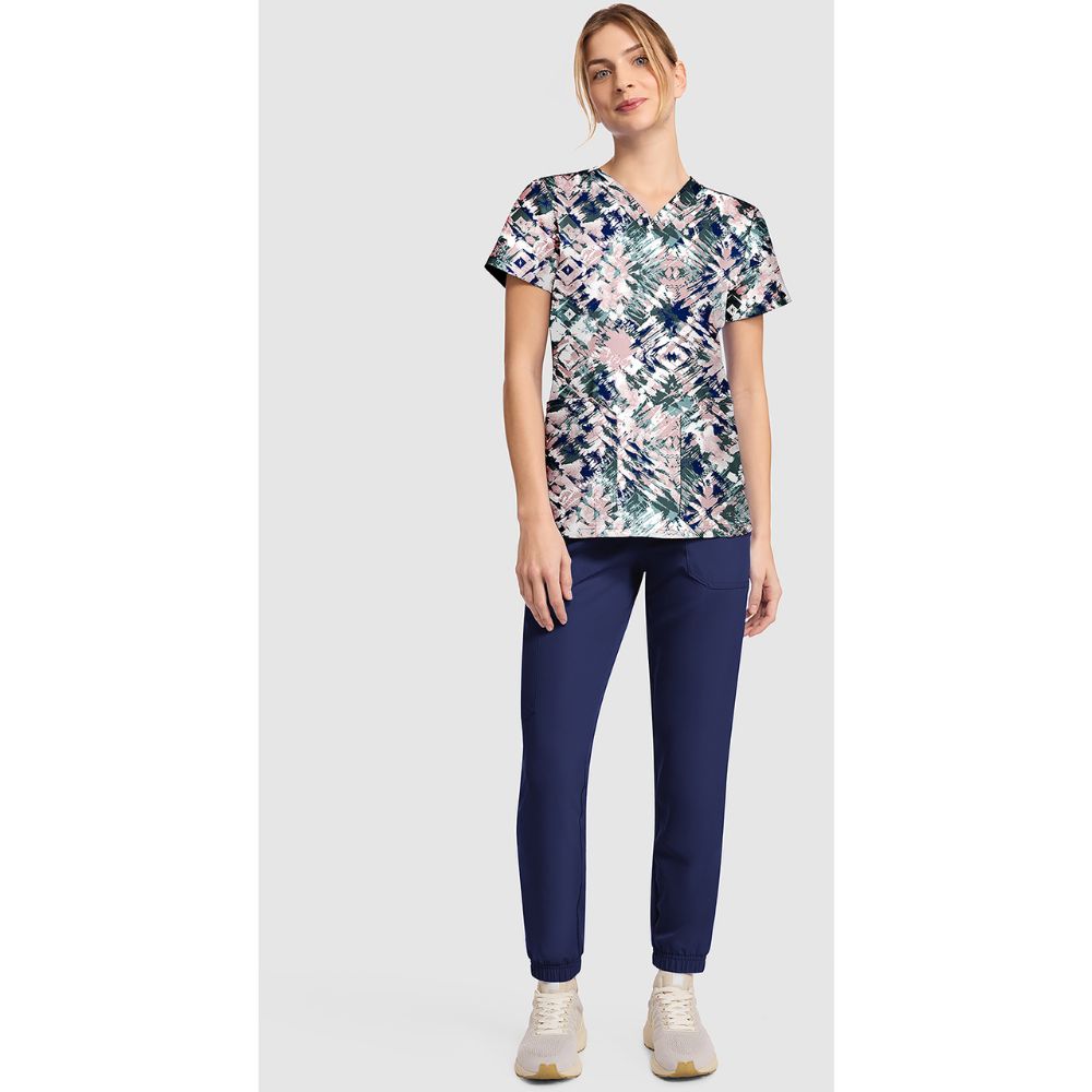 This Contemporary fit v-neck print scrub top has a total of four pockets for organized storage thanks to double patch pockets. There is also a pen/instrument slot on the wearer’s right pocket. Center back length: 25 1/2″