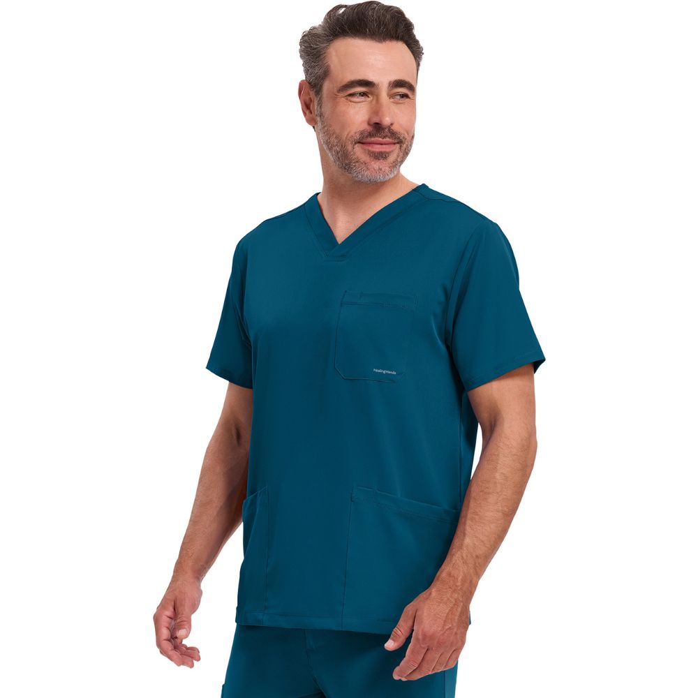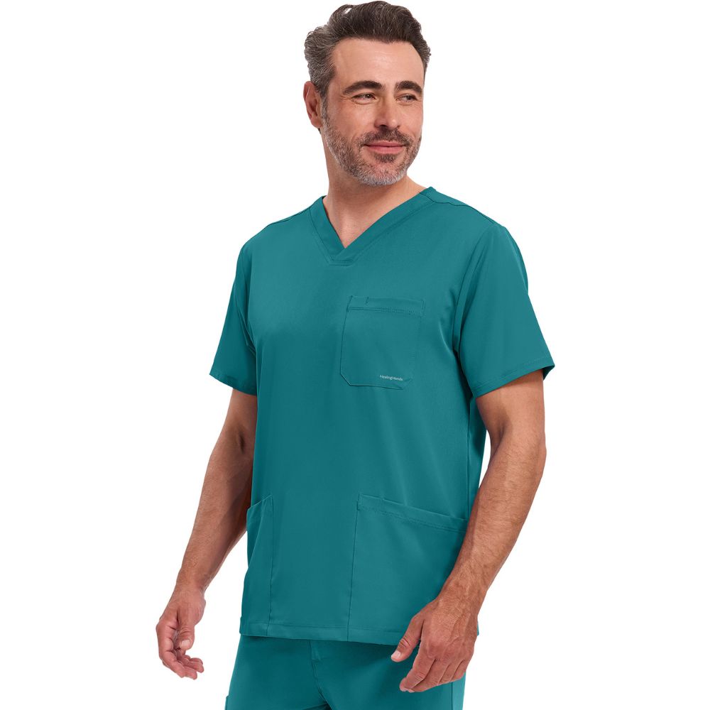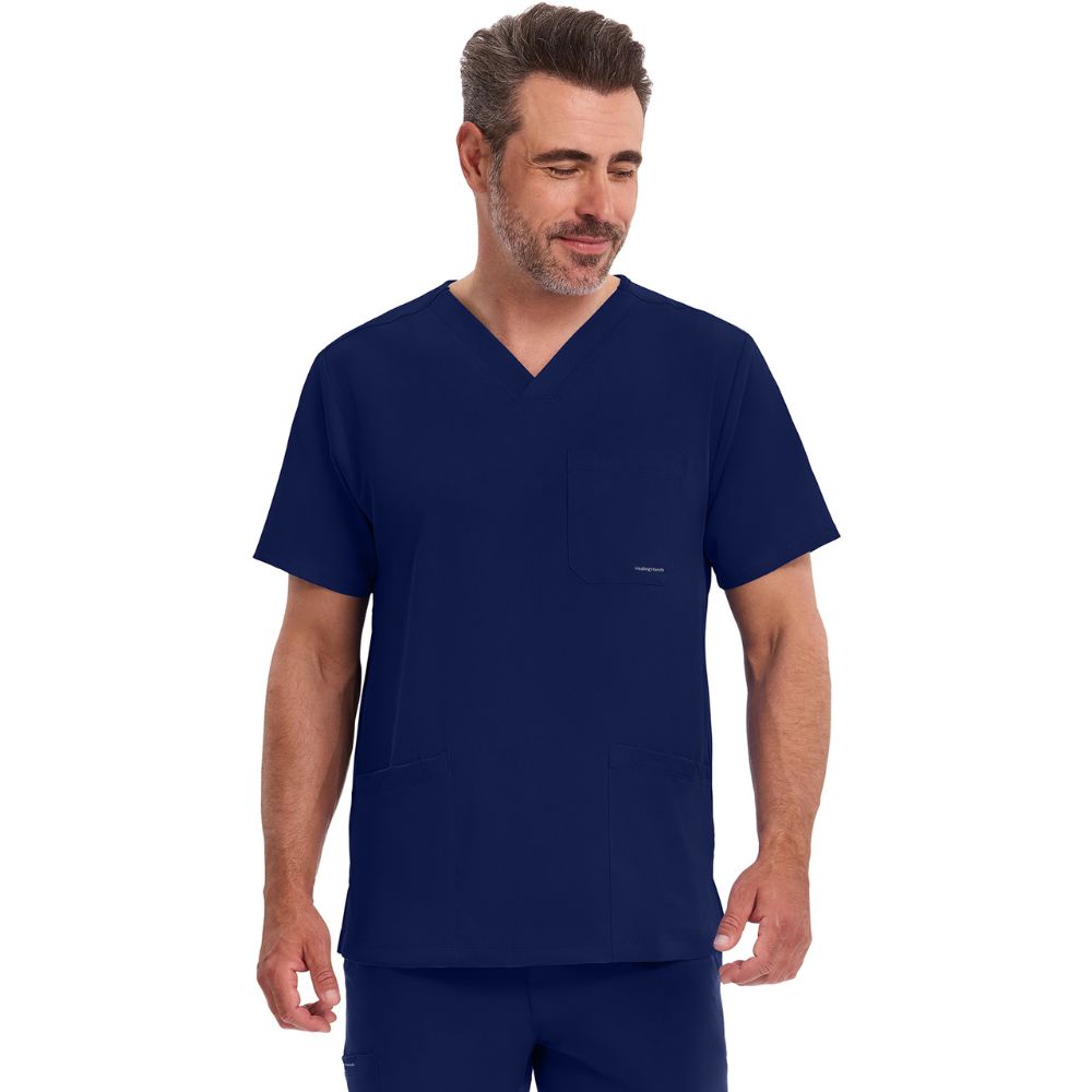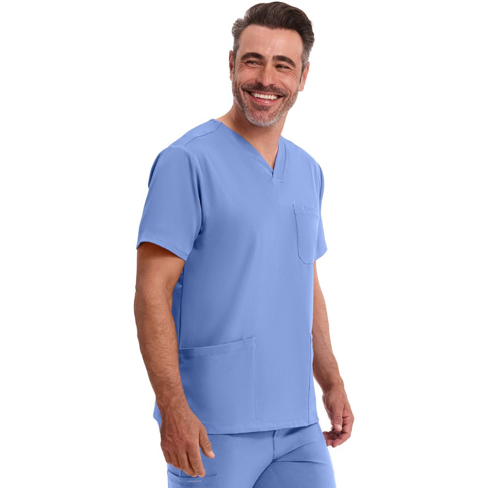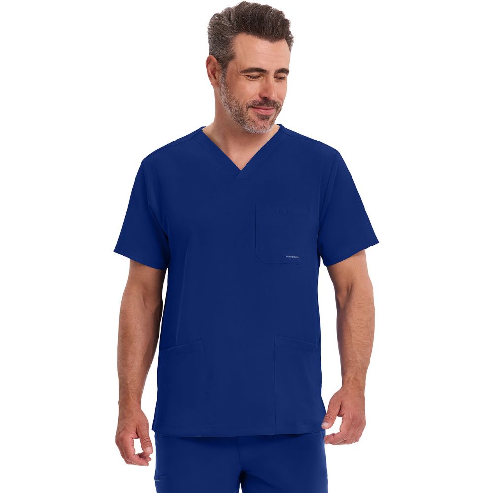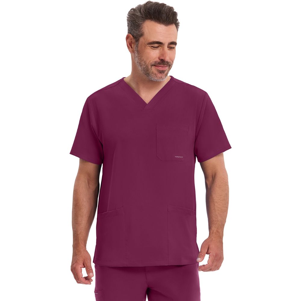 Great group item in a sophisticated style! The men’s Matthew V-Neck Scrub Top features four pockets, including one upper chest pocket on the left with a pen slot, two front angled patch pockets, and a pen slot on the right patch pocket. Side slits and a back yoke provide a better fit.