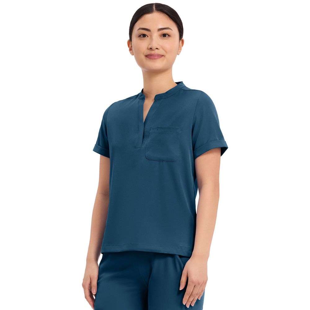 This Macy Top is crafted with the ideal blend of soft yet durable fabric. It features 1 chest pocket and a stylish Mandarin collar with a half placket. The high-low hem and side vents allow for ease of movement, while the French cuffs and Modern fit create a flattering silhouette. Center back length: 25″.