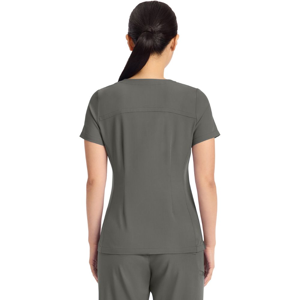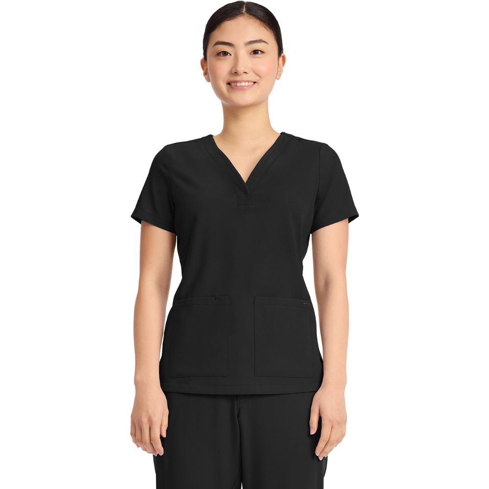 The Quest by Healing Hands Briana Y-Neck Top combines modern style with everyday functionality, featuring a flattering Y-neckline, princess seams, and back darts for a tailored fit. The breathable, moisture-wicking lyocell-blend fabric keeps you cool and composed through long shifts, while three convenient pockets, side vents, and a curved hemline add function and polished style.