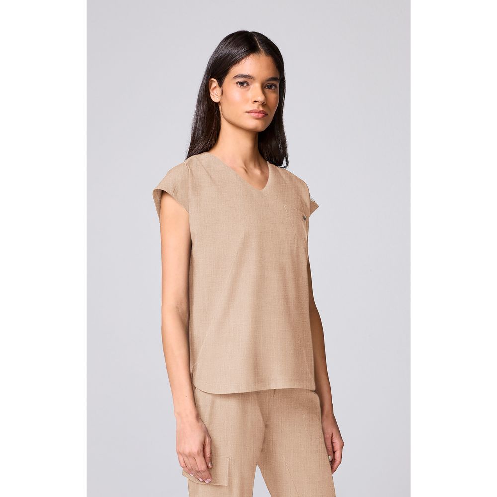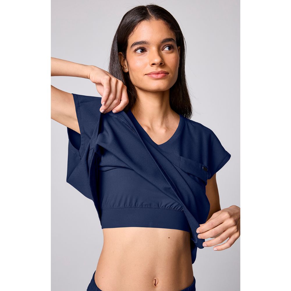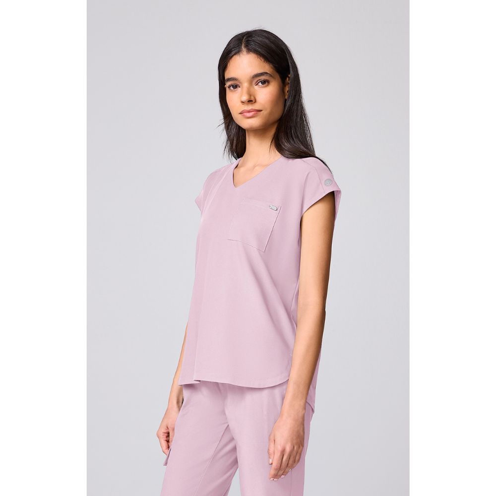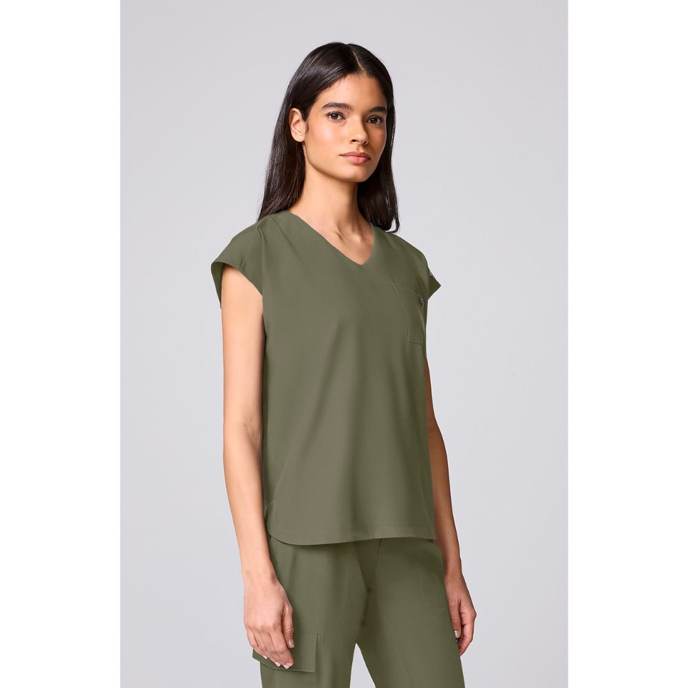 Built-in support meets modern style. This scrub top is designed with a curved V-neckline and a performance knit bra for all-day comfort and coverage. Cap dolman sleeves and a slightly boxy fit create a clean, contemporary shape, while the curved back yoke with pleat, shirttail hem and side vents add easy movement. Finished with a welt chest pocket and signature logo details, it’s made from ultra-soft fabric with 360° stretch to move with you.