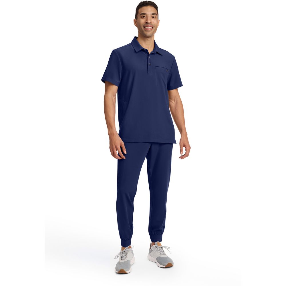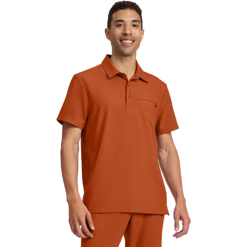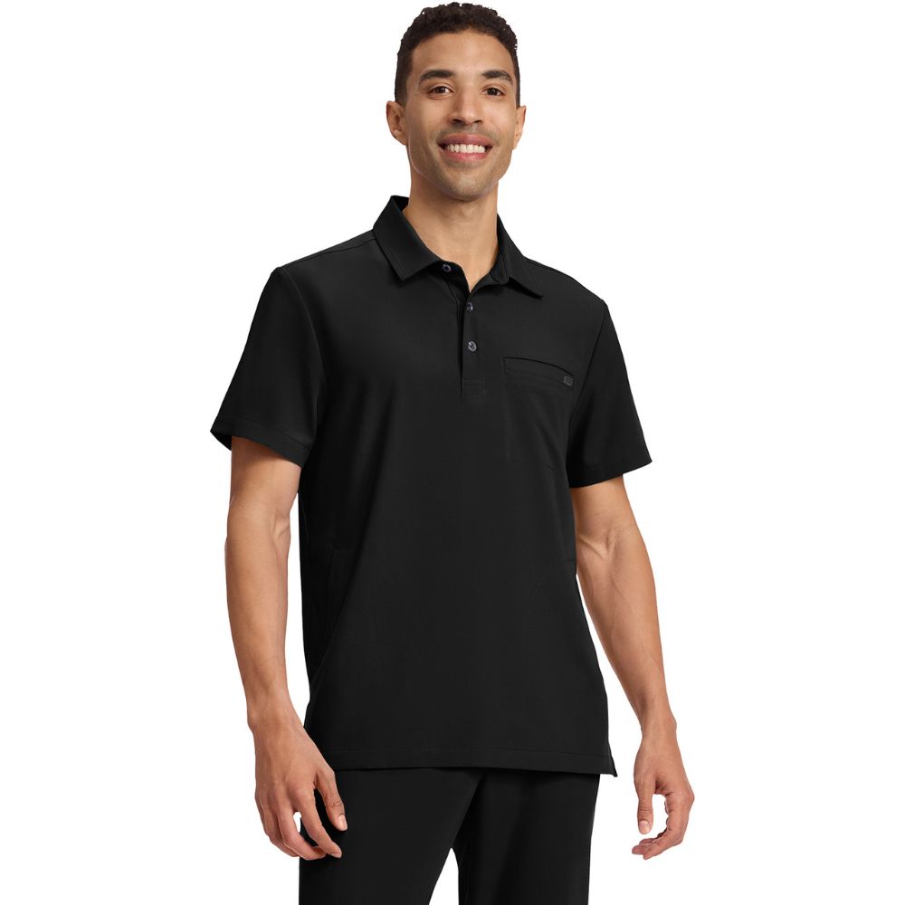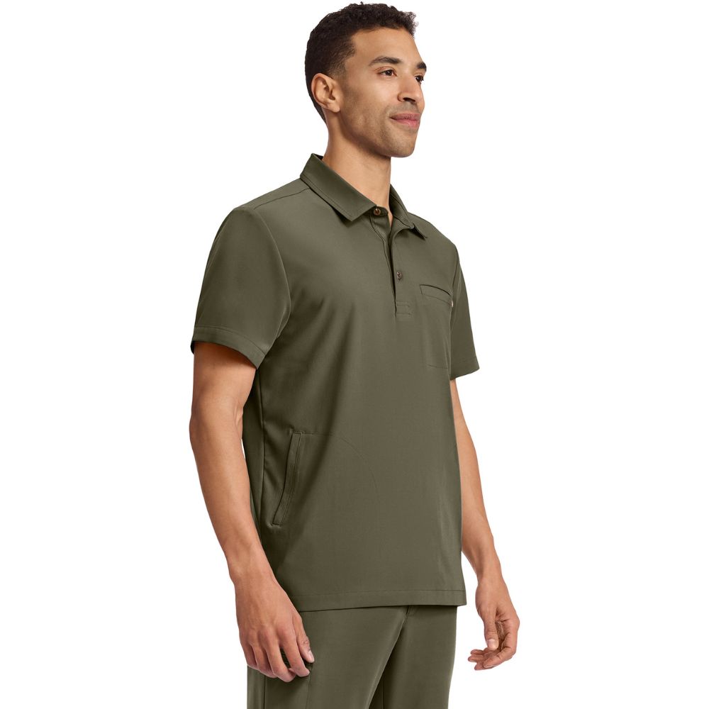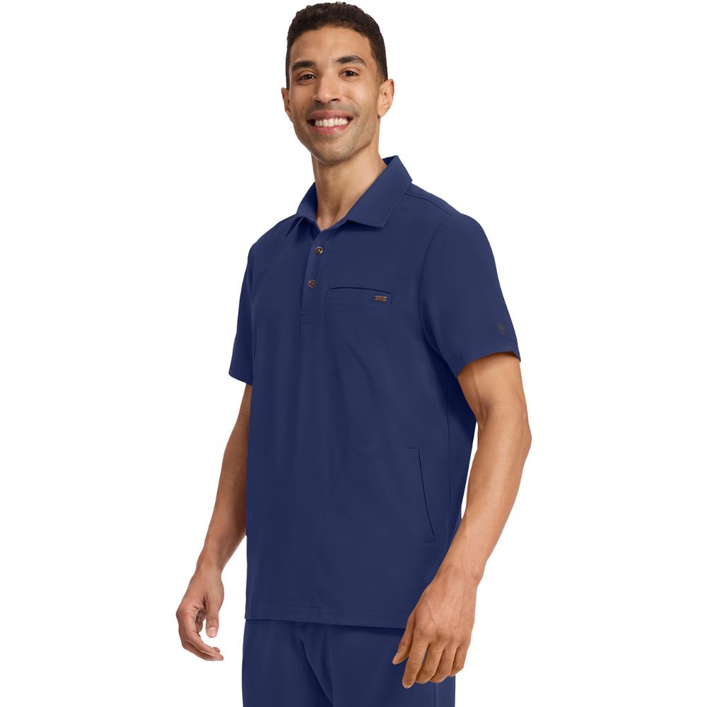 This modern-fit polo collar top combines style and practicality. It features a shirt collar with a 1/2 placket and button closure, plus a signature D-ring detail on the back yoke. With three pockets – one chest welt and two side-entry – this top offers convenient storage. Side slits enhance comfort, while a center back length of 29 1/2″ provides a flattering fit. Ideal for both work and casual wear.