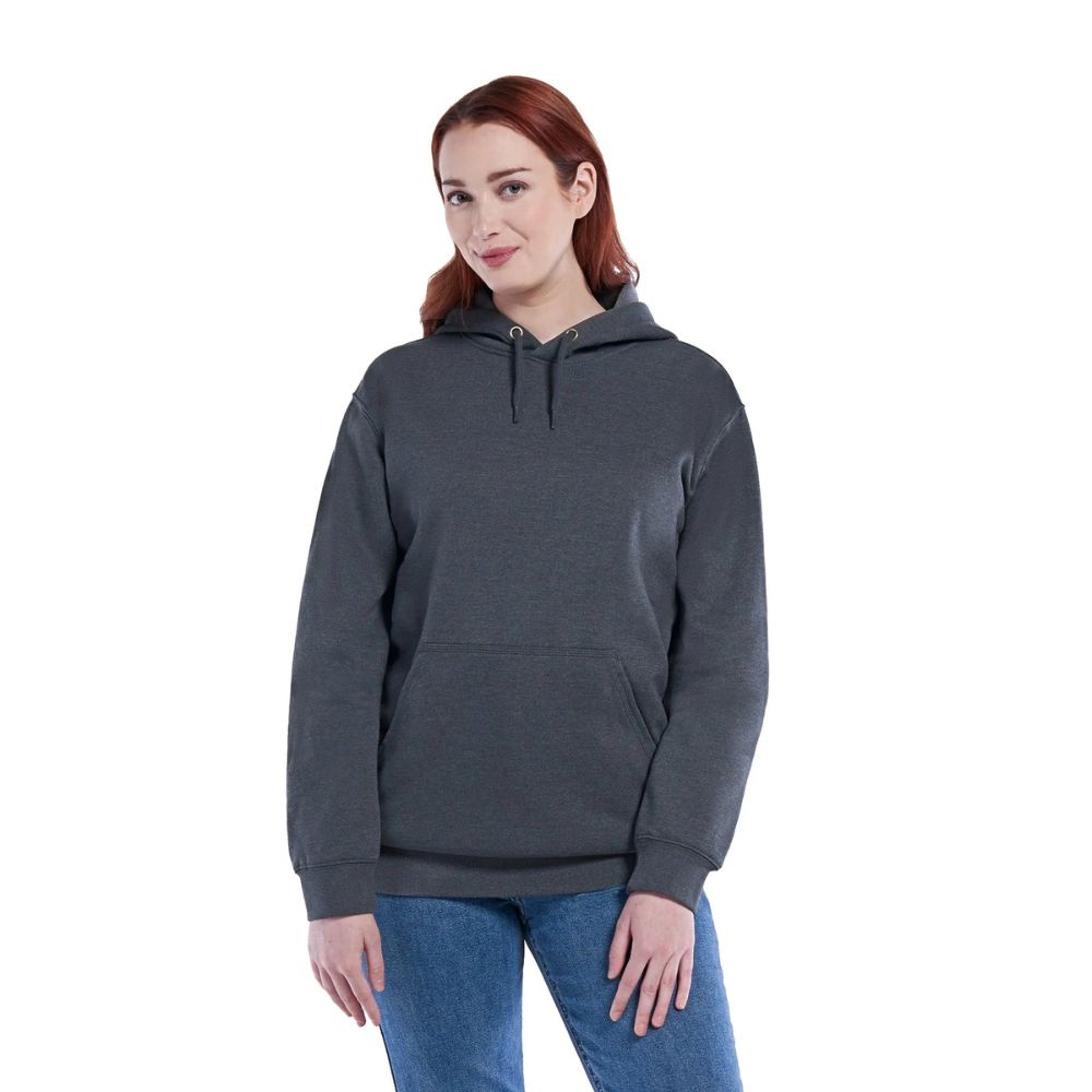 440 gsm – 13 oz./yd² – 21.5 oz./lin. yd 50% cotton, 50% polyester heavyweight fleece with PFC Free water repellent finish. Jersey lined hood with drawcord. Rib knit cuff and hem. Kangaroo pocket with triple needle topstitching and hidden pocket. Tear away label.
