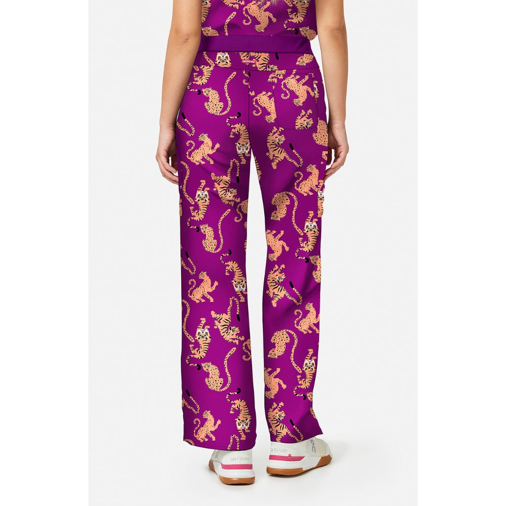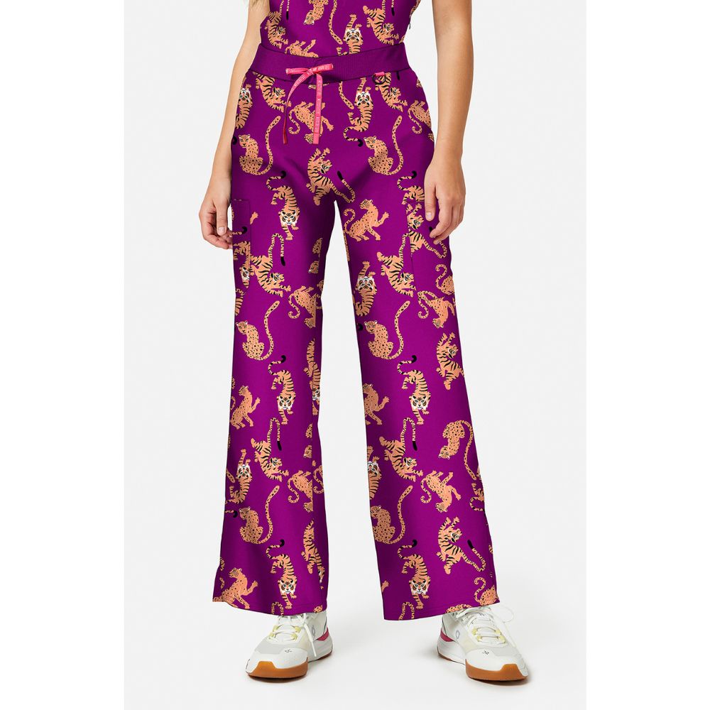 Bold print with a relaxed, functional fit. These scrub pants feature a missy relaxed fit with a mid rise and wide leg for a comfortable, modern silhouette. A rib-knit elastic waistband with an adjustable logo grosgrain drawstring ensures a secure fit, complemented by a badge ID D-ring at the waist. Five pockets (two front slant pockets, two cargo patch pockets with a utility loop at the left and one back patch pocket) offer versatile storage. Finished with a shaped back yoke, side vents at the hem and an allover print for a standout look on shift. Inseam length: 28½”