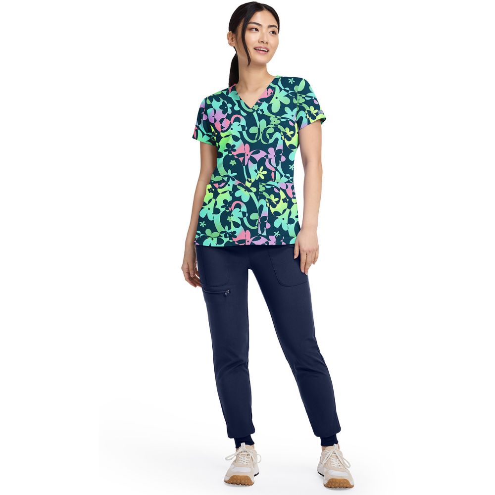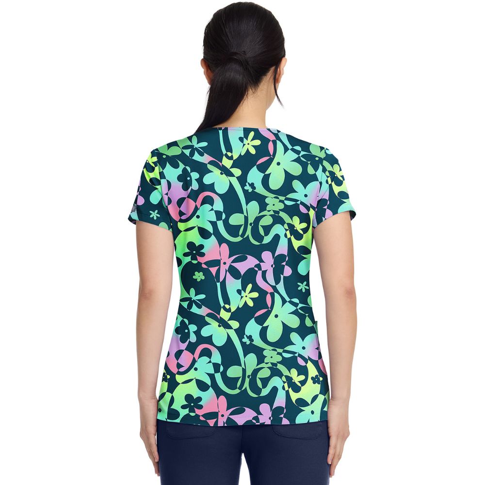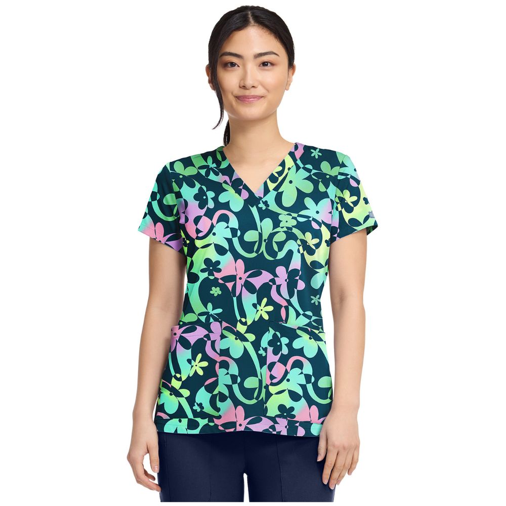 V-neck all-over print top with 2 large patch pockets and a contrast back neck band. Back Length: 26″
